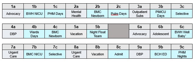 Sample intern schedule and PGY-1 rotations Sample intern schedule Duration of each block (i.e. 1a, 1b, 1c): 2 weeks PGY-1 rotations: